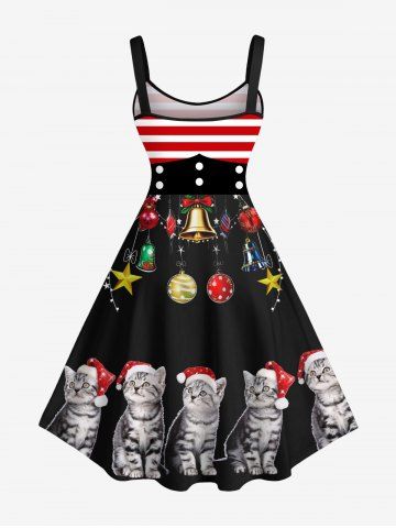 Plus Size Christmas Ball Bell Star Hat Cats Print Tank Dress - Black - L