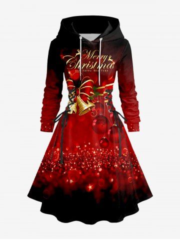 Dresses > Plus Size Christmas Ball Bowknot Bell Sparkling Sequin 3D Print Lace Up Drawstring Hoodie Dress