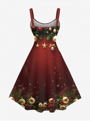 Plus Size Christmas Ball Bowknot Star Tassel Holly Fruit Print Tank Dress - Red - 5x