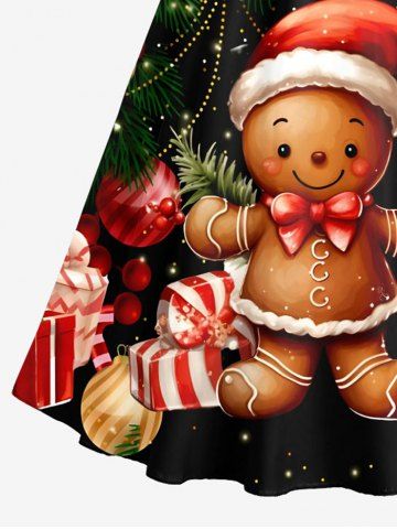 Plus Size Christmas Ball Light Gift Box Gingerbread Man Print Dress With A Belt - Black - 5xl