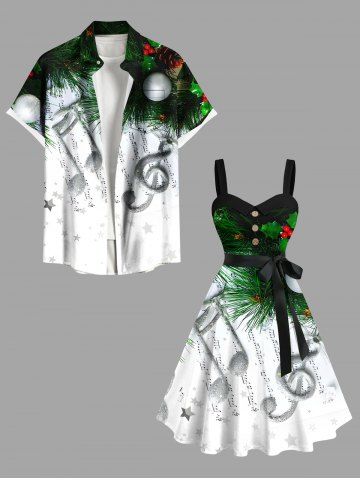 Plus Size Christmas Ball Pinecone Leaf Music Symbol Print Button A Line Dress with Removable Belt - White - 6x