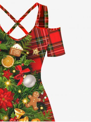 Plus Size Christmas Ball Star Bell Flowers Leaf Gingerbread Plaid Print Cold Shoulder Crisscross Maxi Dress - Red - L
