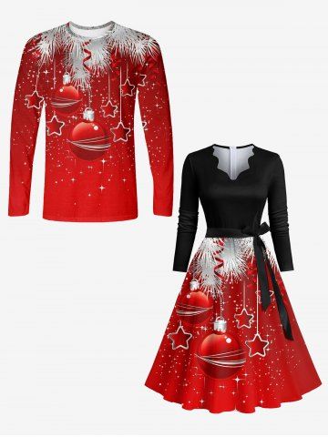 Plus Size Christmas Ball Star Tassel Leaf Glitter 3D Print Scalloped V Neck Dress With A Belt - Red - 3xl