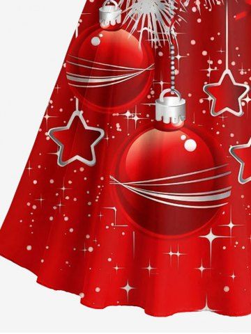 Plus Size Christmas Ball Star Tassel Leaf Glitter 3D Print Scalloped V Neck Dress With A Belt - Red - 6xl