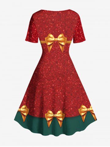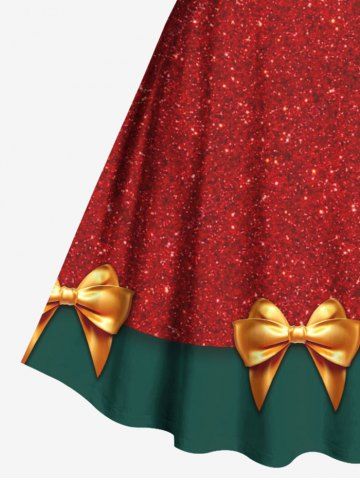 Plus Size Christmas Bowknot Colorblock Sparkling Sequin 3D Print Vintage Dress - Red - 2x