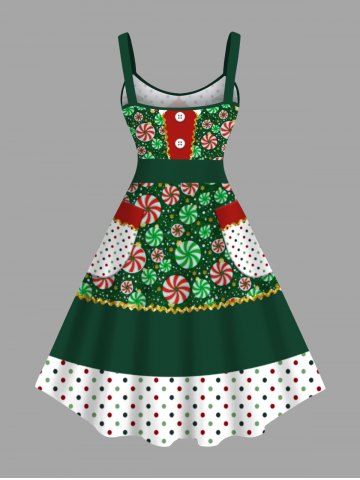 Plus Size Christmas Candy Buttons Polka Dots Pockets Print Tank Dress - Green - 1x
