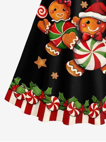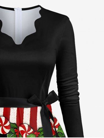 Plus Size Christmas Candy Holy Fruit Gingerbread Star Print Scalloped V Neck Dress With A Belt - Black - 2xl