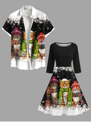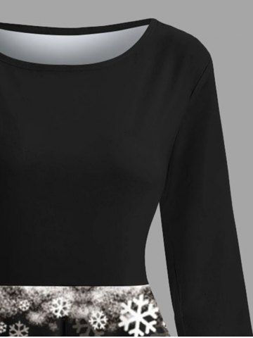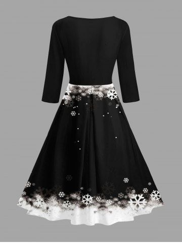 Plus Size Christmas Cats Snowflake Colorblock Print 3/4 Sleeves Vintage Dress - Black - 3xl