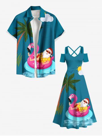 Plus Size Christmas Coconut Tree Santa Claus Swimming Ring Cloud Print Hawaii Cold Shoulder Crisscross A Line Maxi Dress - Green - S
