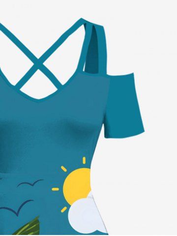 Plus Size Christmas Coconut Tree Santa Claus Swimming Ring Cloud Print Hawaii Cold Shoulder Crisscross A Line Maxi Dress - Green - 5x