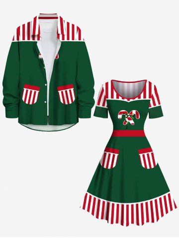Plus Size Christmas Elf Candy Stripes Print Vintage Dress - Green - M