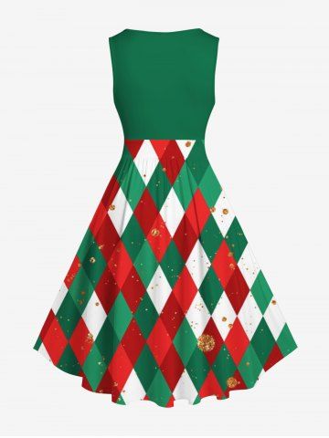 Plus Size Christmas Elf Rhombus Lattice Colorblock Print 1950s Vintage Dress - Green - 2x
