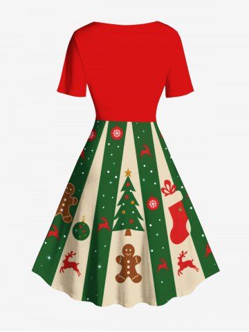 Plus Size Christmas Elf Tree Gingerbread Snowflake Elk Print Vintage Dress - Red - S