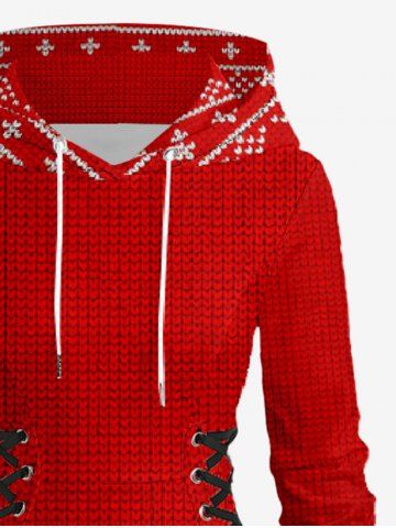 Plus Size Christmas Elk 3D Knit Print Lace Up A Line Hooded Dress - Red - Xs