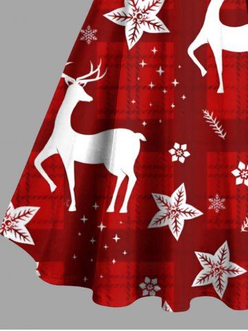 Plus Size Christmas Elk Flower Plaid Print Button A Line Dress with Removable Belt - Deep Red - 5x