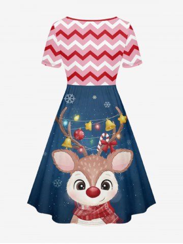 Plus Size Christmas Elk Snowflake Ball Galaxy Zig Zag Print Cinched A Line Dress - Navy Blue - S