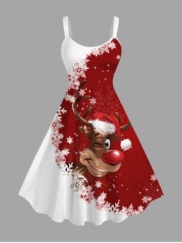 Plus Size Christmas Elk Snowflake Colorblock Print Tank Dress - Red - 5x