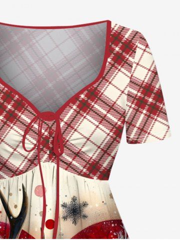Plus Size Christmas Elk Snowflake Plaid Print Cinched A Line Dress - Red - M
