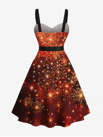 Plus Size Christmas Fireworks Spider Web Glitter 3D Print Buttons Turn Down Collar Dress With Belt - Orange - 5x