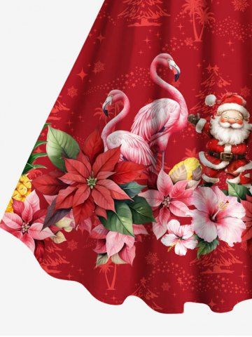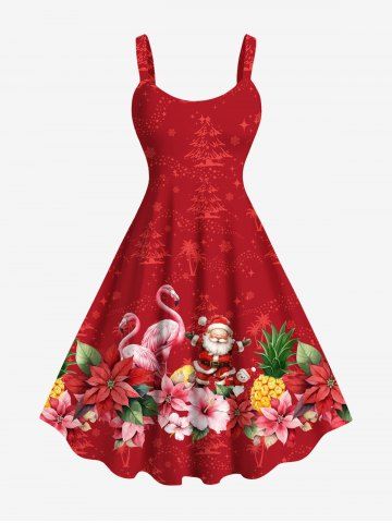 Plus Size Christmas Flamingo Santa Claus Pineapple Flowers Print Tank Dress - Cherry Red - L