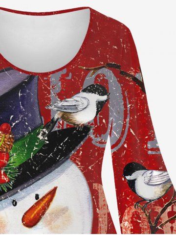 Plus Size Christmas Flower Snowman Bird Heart Print Bell Sleeves Dress - Red - 4x
