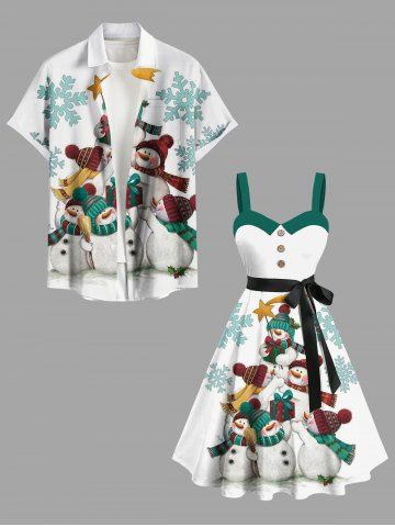 Dresses > Plus Size Christmas Gift Snowflake Snowman Print Button A Line Dress with Removable Belt