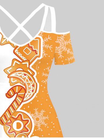 Plus Size Christmas Gingerbread Man Candy Donut Snowflake Colorblock Print Cold Shoulder Crisscross Maxi Dress - Orange - Xs