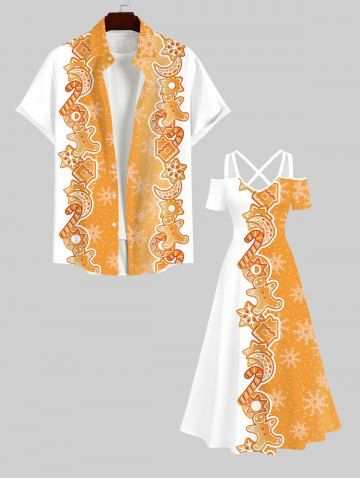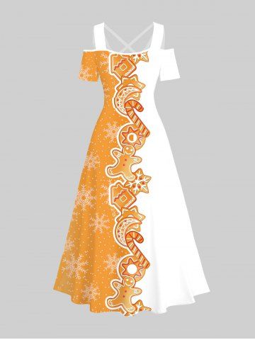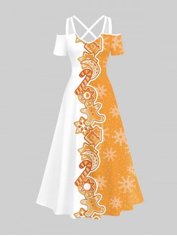 Plus Size Christmas Gingerbread Man Candy Donut Snowflake Colorblock Print Cold Shoulder Crisscross Maxi Dress - Orange - 1x