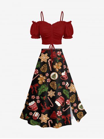 Plus Size Christmas Gingerbread Star Bowknot Candy Snowflake Print Split Skirt - Black - 3x