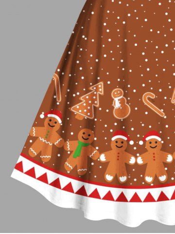 Plus Size Christmas Gingerbread Tree Snowman Snowflake Candy Print Vintage Dress - Light Brown - L