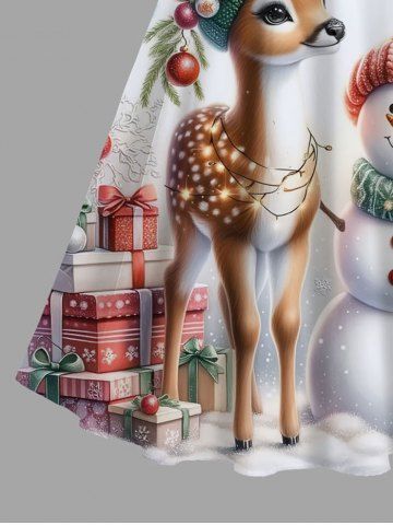 Dresses > Plus Size Christmas Hat Elk Snowman Gift Box Print Scalloped V Neck Dress With A Belt
