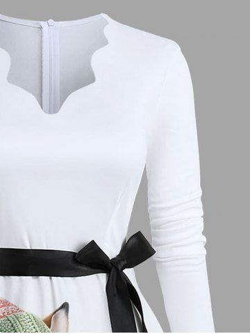 Plus Size Christmas Hat Elk Snowman Gift Box Print Scalloped V Neck Dress With A Belt - White - 5xl