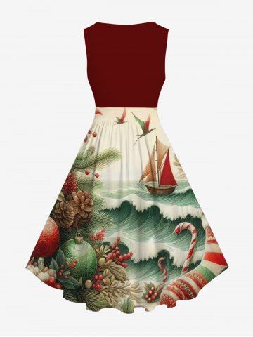 Plus Size Christmas Holly Candy Sea Waves Sailboat Print Cruise Vintage Swing A Line Dress - Red - 5x