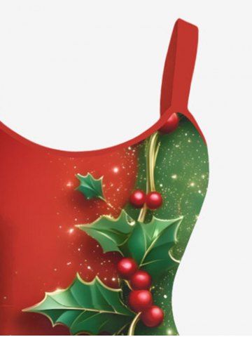 Plus Size Christmas Holly Fruit Leaf Colorblock Glitter 3D Print Tank Dress - Red - S