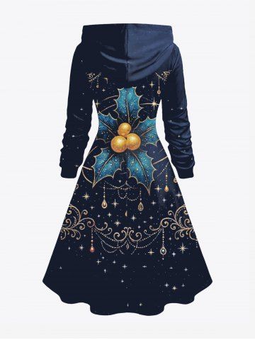 Plus Size Christmas Holly Fruit Leaf Star Tassel Print Lace Up Drawstring Hoodie Dress - Black - S
