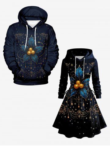 Plus Size Christmas Holly Fruit Leaf Star Tassel Print Lace Up Drawstring Hoodie Dress - Black - M