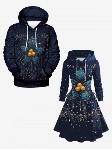 Dresses > Plus Size Christmas Holly Fruit Leaf Star Tassel Print Lace Up Drawstring Hoodie Dress