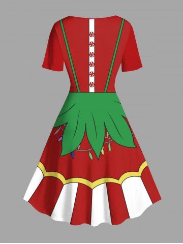 Plus Size Christmas Light Elf Candy Print Vintage Dress - Red - L