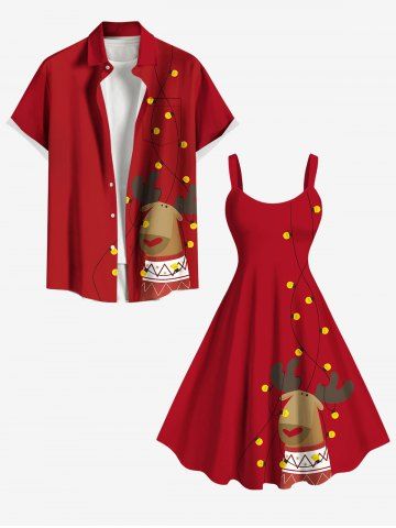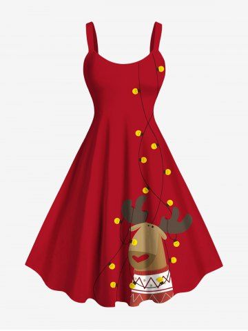 Plus Size Christmas Light Elk Print A Line Dress - Red - 1x