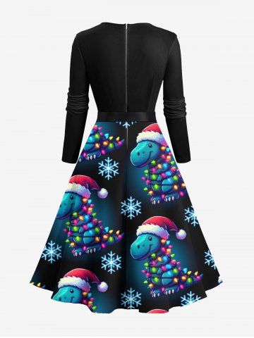 Plus Size Christmas Light Hat Snowflake Dinosaur Print Scalloped Neck A Line Dress with Removable Belt - Black - 2xl