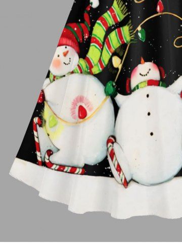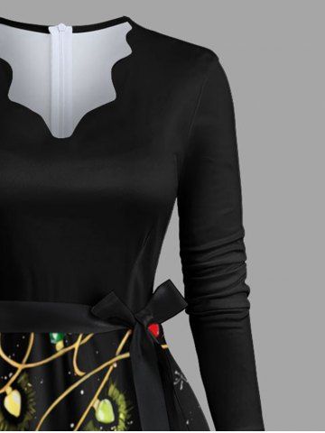 Plus Size Christmas Light Snowman Snowflake Colorblock Print Scalloped V Neck Dress With A Belt - Black - 2xl