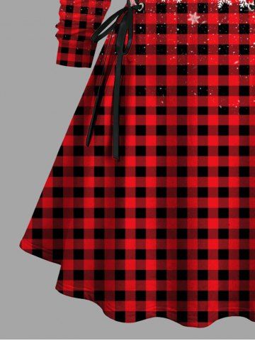 Plus Size Christmas Plaid Elk Bowknot Snowflake Print Drawsting Hoodie Dress - Red - M