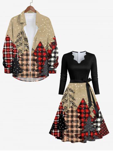 Dresses > Plus Size Christmas Plaid Tree Snowflake Print Lettuce A Line Dress with Tied Belt