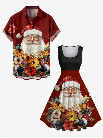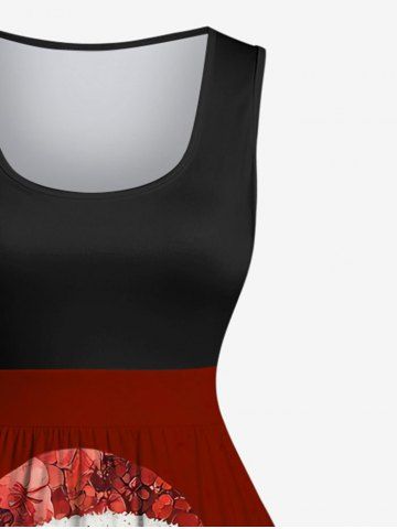 Plus Size Christmas Santa Claus Colorful Flower Print Vintage Swing A Line Dress - Black - L