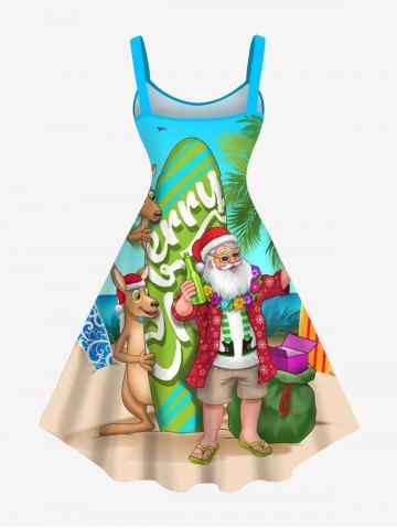 Plus Size Christmas Santa Claus Elk Coconut Tree Print Tank Dress - Light Blue - 3x