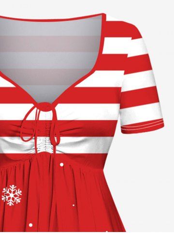Plus Size Christmas Santa Claus Elk Snowflake Holly Fruit Stripes Print Cinched Dress - Red - Xxs