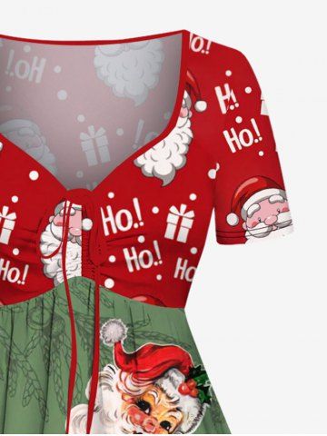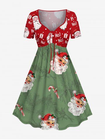 Plus Size Christmas Santa Claus Gift Letter Candy Branch Print Cinched A Line Dress - Green - 2x