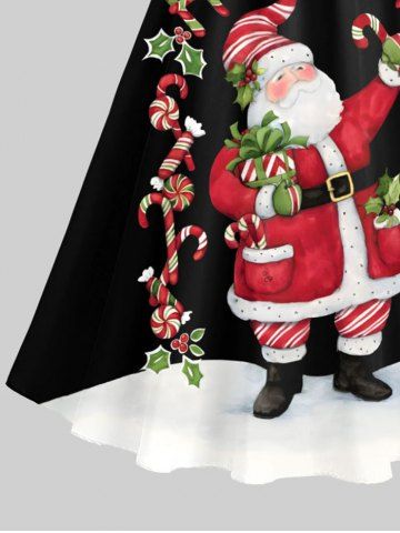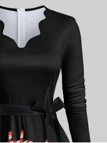 Plus Size Christmas Santa Claus Holy Fruit Leaf Candy Colorblock Print Scalloped Trim V Neck Dress With A Belt - Black - 7xl