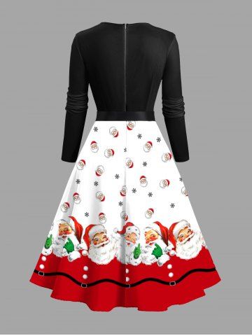 Plus Size Christmas Santa Claus Snowflake Colorblock Print Scalloped V Neck Dress With A Belt - Black - 2xl