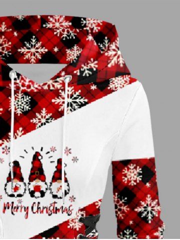 Plus Size Christmas Santa Claus Snowflake Plaid Print Lace Up Drawstring Hoodie Dress - Red - M